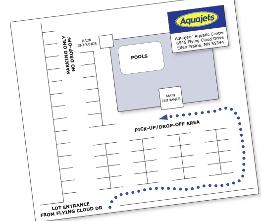 Make an immediate right as you turn into the Aquajets’ Aquatic Center. Proceed to the last row of parking spaces and get in the queue for the front entrance. As you advance to the front of the line, please go as far as the accessible spaces and either drop off or wait for your swimmer(s). Note: Do not block those who need to use the accessible spots, and do not wait in these spots for your swimmer(s). At the beginning of the season, the line tends to be a little slow...but families soon figure it out and things quickly begin to move along more efficiently.
